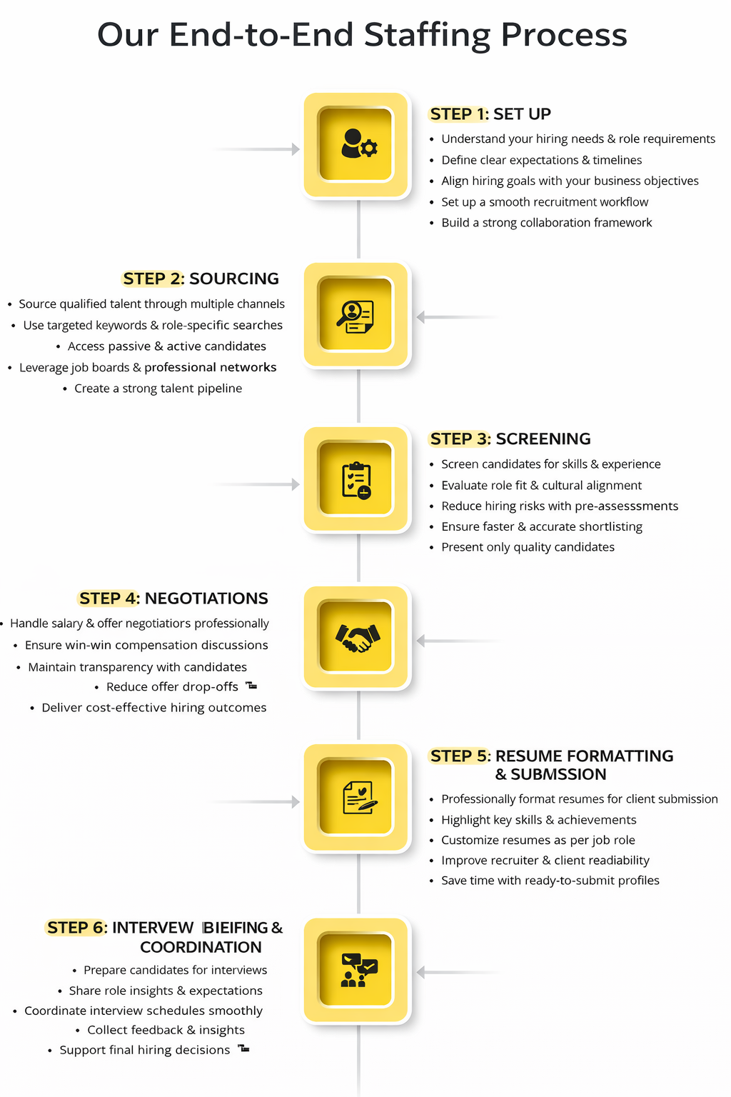 Being a well-established staffing company that helps US businesses in filling their workforce requirements, we provide solutions that focus on flexibility and accuracy. These include staffing requirements that make various activities related to recruiting smoother and better.